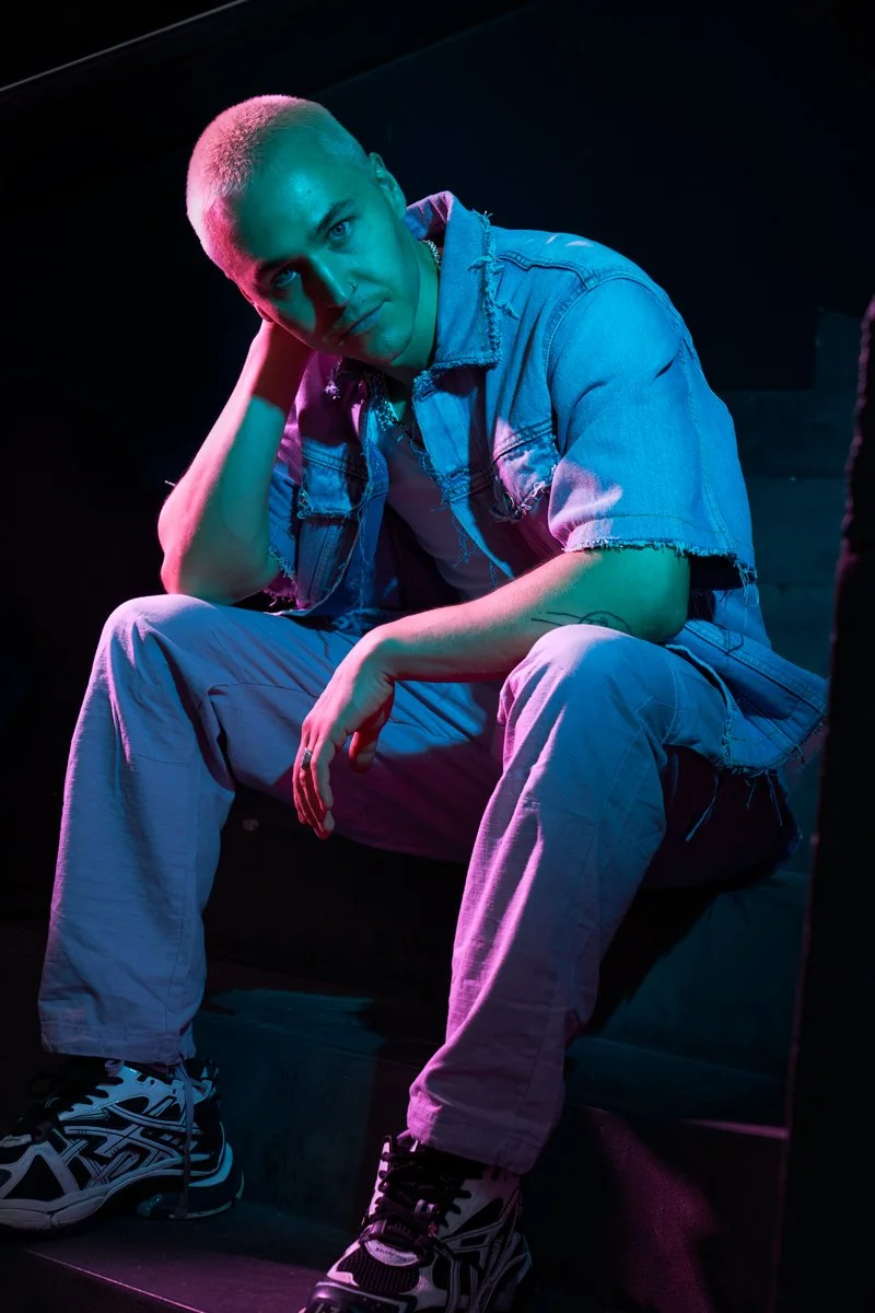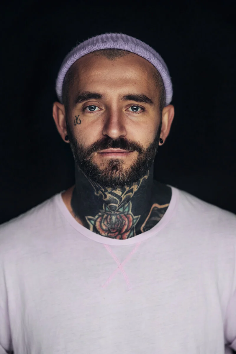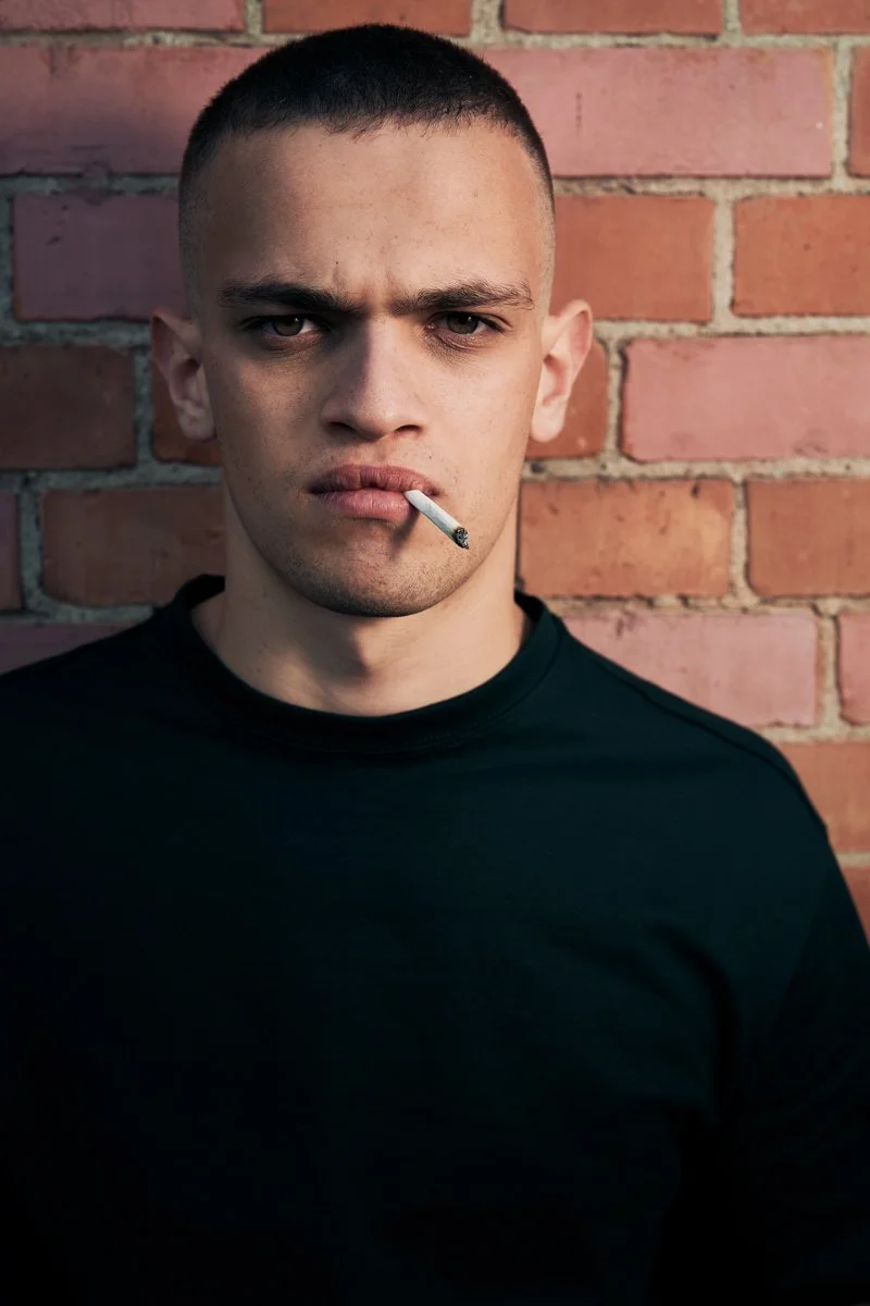 Auf diesem intensiven Portrait wirkt Evil Jared ernst, entschlossen und fokussiert. Sein direkter Blick strahlt Stärke und Selbstbewusstsein aus und unterstreicht seine markante Persönlichkeit. Gekleidet in einer schwarzen Lederjacke spiegelt das Fot