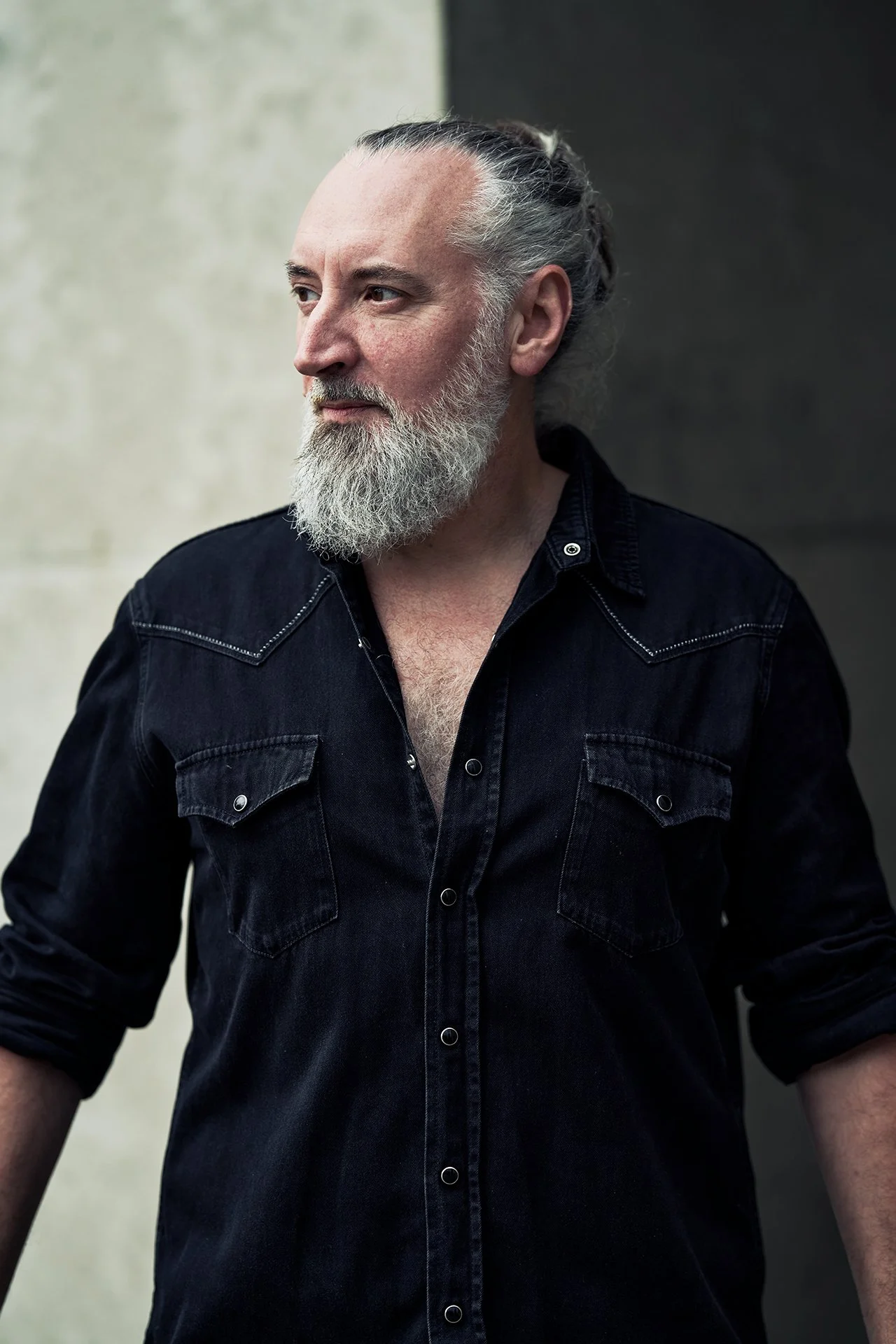 Auf diesem Porträt zeigt sich der britische Musiker Fink (bürgerlich Fin Greenall) in einer kraftvollen, fast ikonischen Pose: leicht im Profil, der Blick in die Ferne gerichtet – fokussiert