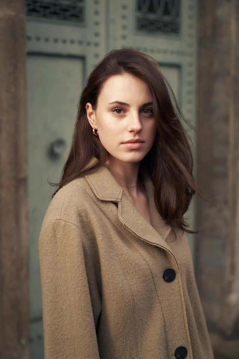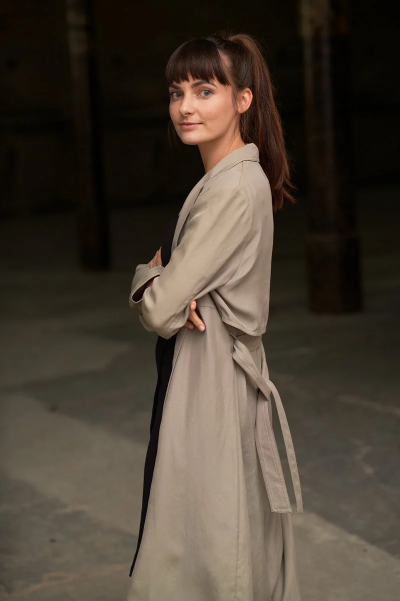 Auf diesem Porträt zeigt sich Britta Thie in einer bewusst reduzierten Komposition: Ein brauner Mantel, neutraler Hintergrund und ein ruhiger Im Vollbildmodus anzeigen