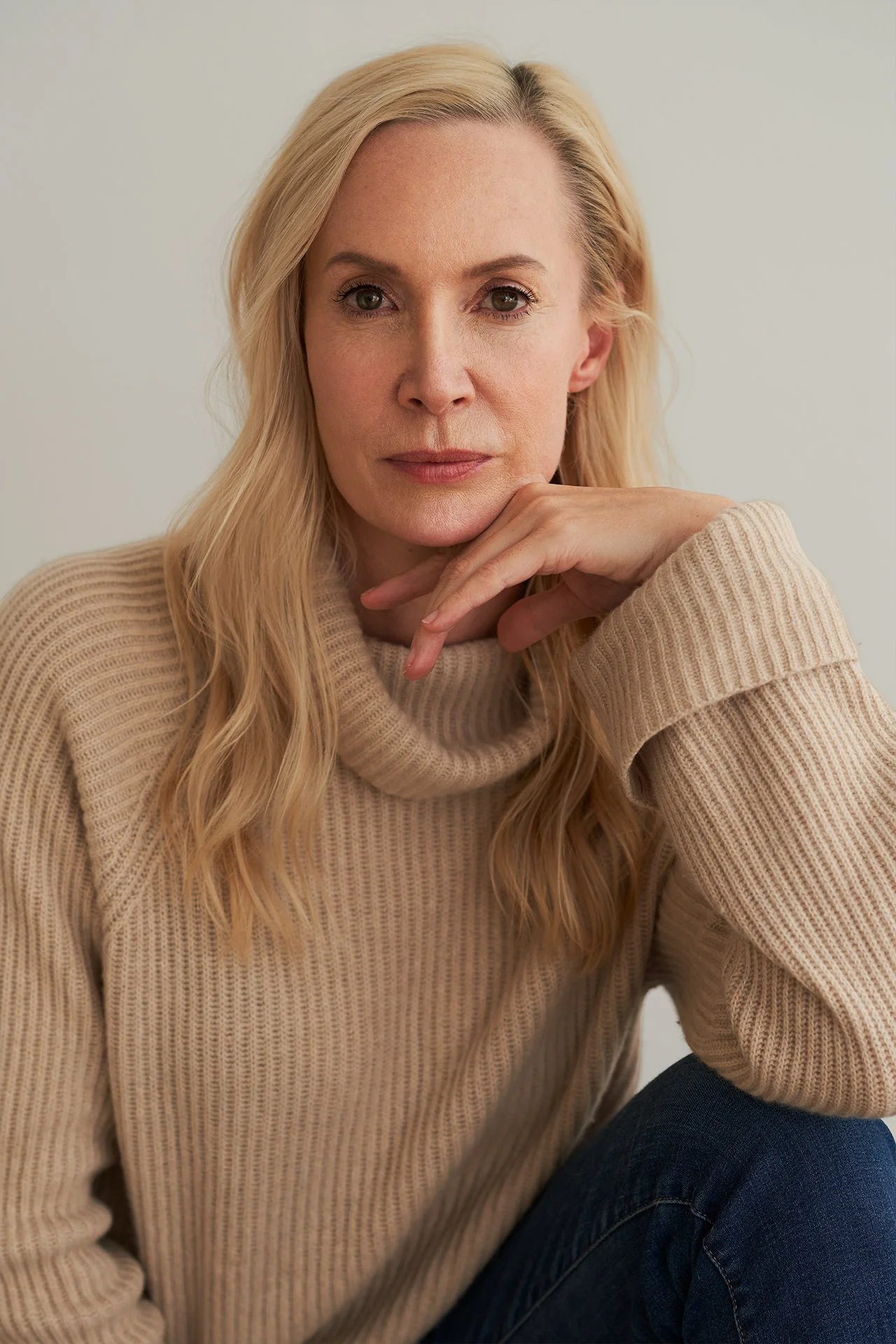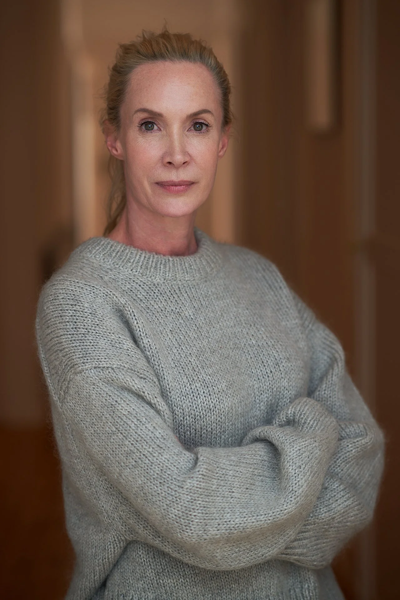 Auf diesem Porträt zeigt sich Britta Thie in einer bewusst reduzierten Komposition: Ein brauner Mantel, neutraler Hintergrund und ein ruhiger